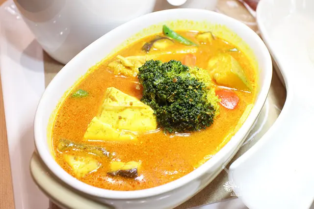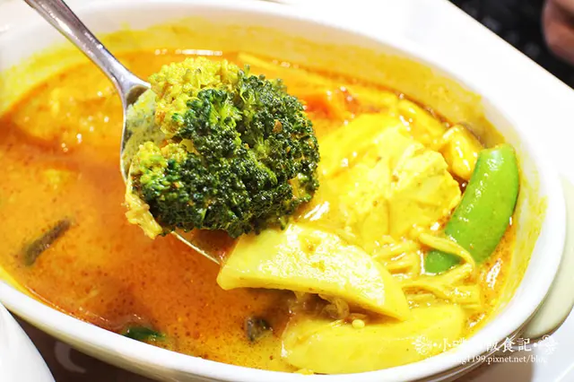 陽光花園鮮蔬是道素食咖哩,綜合多種蔬菜(青花菜.香菇.荷蘭豆.新鮮豆腐.甜椒.金針菇)...等新鮮蔬菜熬煮的咖哩,能品嚐到蔬菜的原味鮮甜,平時吃慣大魚大肉的我們,也該讓腸胃舒緩一下了!!!咖哩的味道蠻清淡的,屬於"中辣",口感鮮甜入口,不會有負擔,滋味淡雅清爽,帶點適度的辣度,吃素的朋友很喜歡!!!