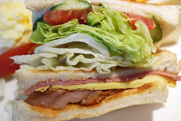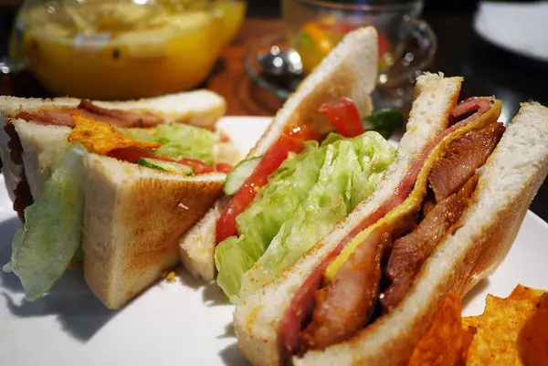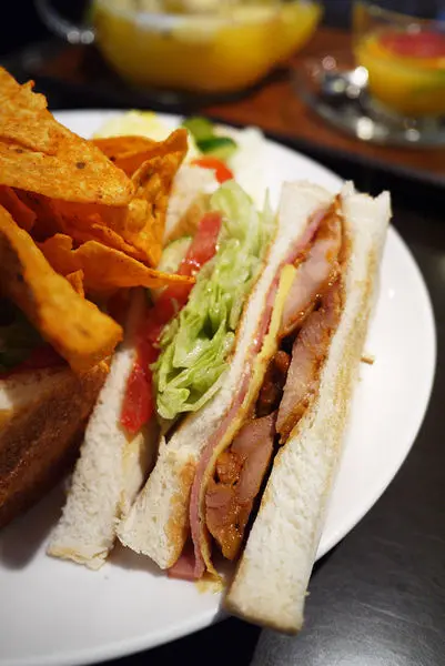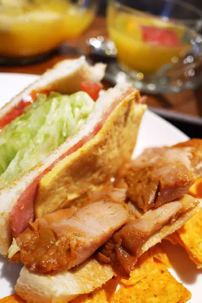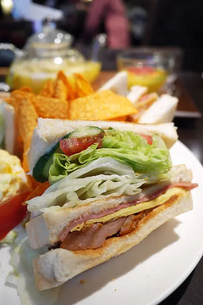 總匯三明治整份切成三大片,裡面包有大量生菜、蕃茄、火腿、蛋皮和豬排,內容算蠻豐富的,滿滿的整盤送上桌也給人視覺上的滿足!大口咬下真的很讚!用料新鮮又實在。