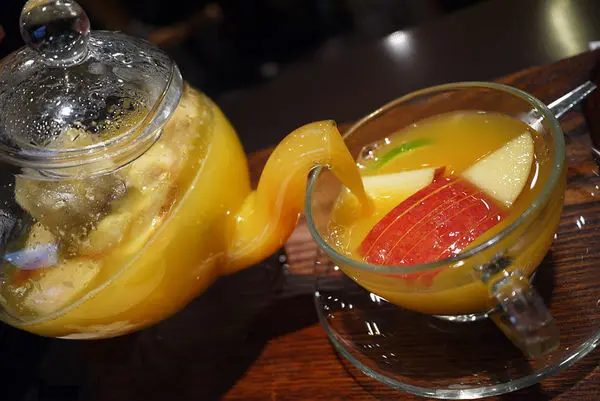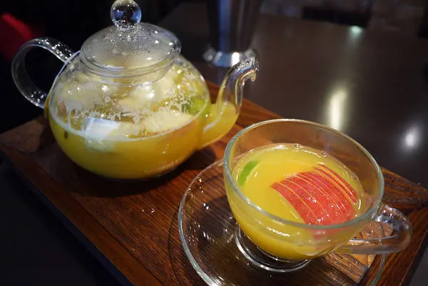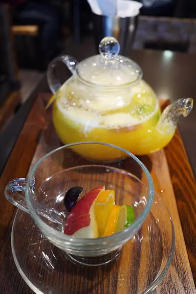 點餐後很快的先送上飲料,我點的熱鮮果茶,透明的玻璃杯組,可以看到裡面的內容物,杯子裡先擺了新鮮水果切片,像是蘋果、柳橙、芭藥、葡萄、檸檬等。