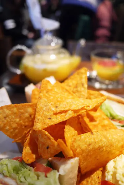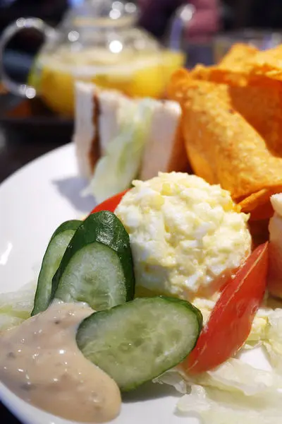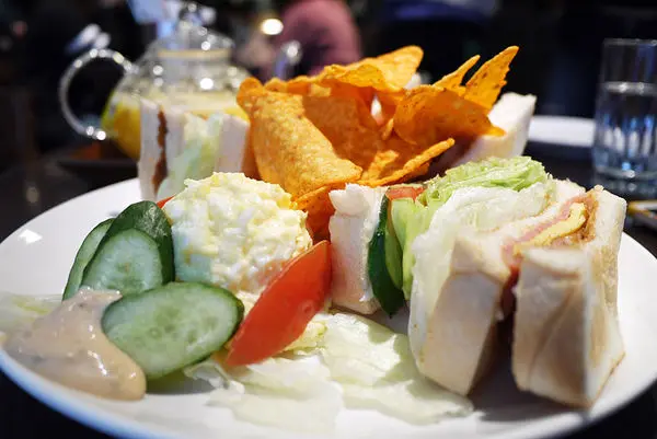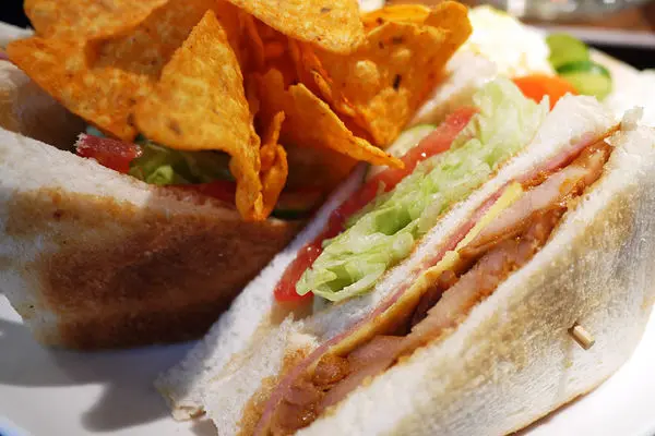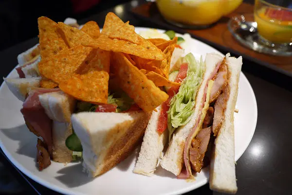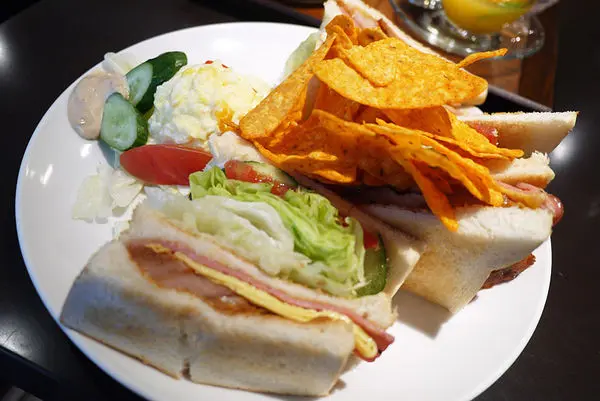 餐的部份我點了一份總匯三明治來品嚐,這樣一份170元,除了三明治外,整盤裡還有蛋沙拉、生菜和多力多茲脆片。