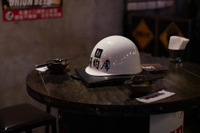 先前預約好的座位更是趣味的擺放工地帽,好有趣!與其說是工業,還多了點工地風?Ha.