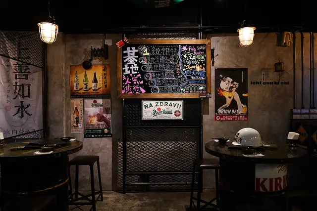 濃厚的工業風格充滿各個角落,滿滿的汽油桶、鐵網、鐵鍊,營造出整體氛圍,我認為可以是居酒屋也可以是屬於你的酒吧,喜愛熱鬧的你,我想你可以選擇在吧檯與師傅一同聊天喝酒作樂,情人小酌,桶桌無誤!基地還提供了兩個包廂都有低消,有大有小,裡面還有屬於自己的投影機,很適合多人聚餐、公司行號小聚!話不多說,準備展開屬於我今晚的熱鬧。