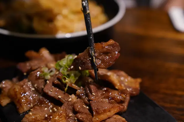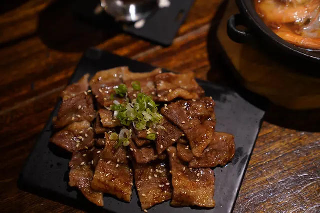牛五花包覆著蘋果絲,也能如此豐富美味!炙烤後的鹹香牛五花,肉汁與焦香在嘴裡遊蕩,藉由蘋果絲清甜的滋味,混和了彼此,口感親切,纏繞於口中的滋味遲遲不肯散去。