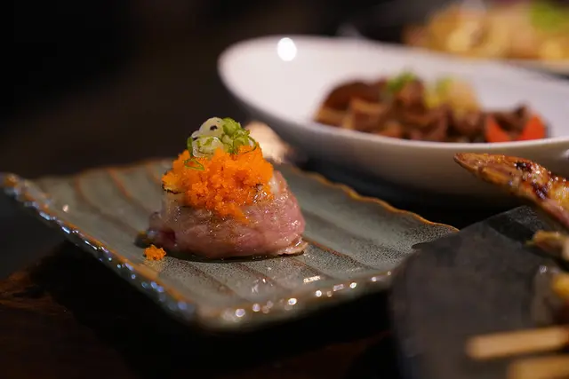 幸福的滋味,我想就是這麼簡單?粉嫩柔軟的牛肉,緊緊包覆著半熟的生干貝,又鮮又甜的曼妙滋味,滿足了此刻,點綴的蝦卵,讓口感增添了幾分趣味,好滿足好歡樂!