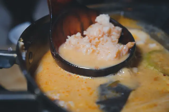 栗子南瓜、香菇、青蔥、海帶絲、蛋黃當然還有濃郁的叻沙湯頭以及剛才海鮮盤的蝦頭熬煮。