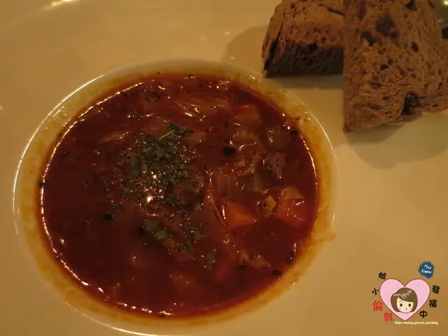 馬上進入湯品的前奏,羅宋湯的番茄味還滿濃郁的但也不會過於膩口