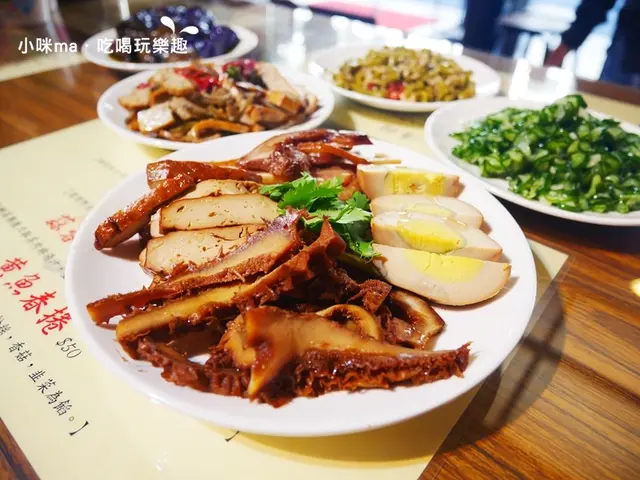 拼盤裡有豆干、牛肚、滷蛋、豬耳朵,不用沾醬,單吃就很夠味