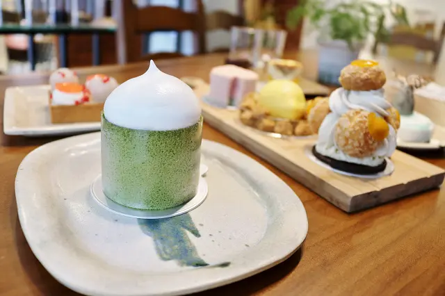 抹茶蛋糕體、柚子奶餡、抹茶白巧克力慕斯、檸檬蛋白霜