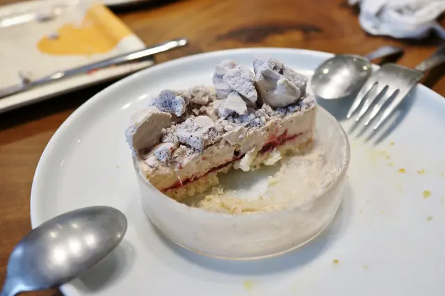 法式蛋白餅、栗子慕斯、紫羅蘭莓果醬、杏仁蛋糕體