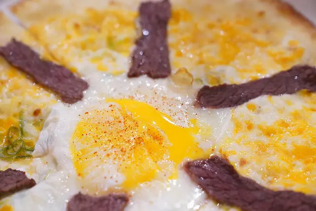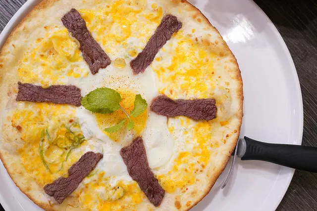 這種薄餅披薩真的是很喜愛,邊緣酥脆可口,像極了餅乾,溫體牛洋洋灑灑的圍了一圈,我還記得刀劃下去的那一刻,蛋黃瞬間溢流奔放的畫面實在美,溫體牛的滑香,蛋汁的香濃,實屬味美。