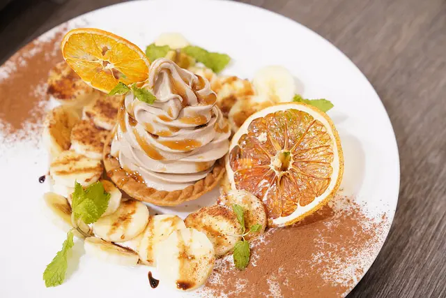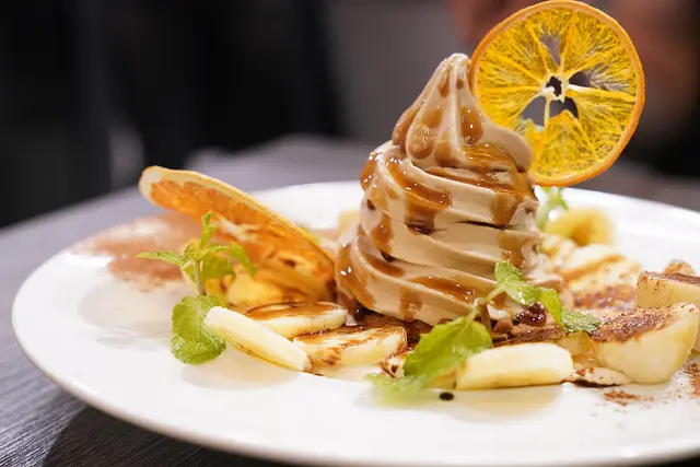 準備上甜點的時候服務人員都會將桌面整理乾淨!有聖代跟鬆餅兩種甜點可以選,我們就選了聖代,吃太飽了!冰淇淋是奶茶口味,淋上焦糖醬真的是無比罪惡!一旁還有香蕉切片,可可粉、焦糖、鮮奶油,真的是太邪惡!一口冰淇淋一口香蕉,可以說是最美的結局。