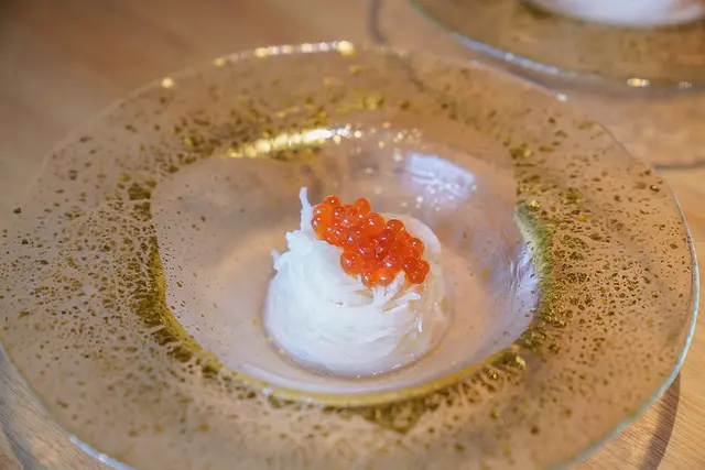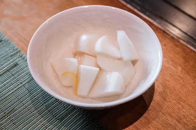 用醃製過後的蘿蔔來開胃,淡雅的柚子的清香,爽脆可口。