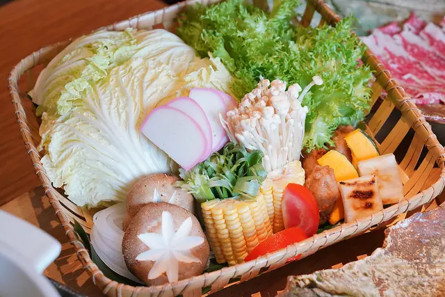 相當豐盛的一份菜盤!白菜、綠色蔬菜、青蔥、香菇、金針菇、烤麻糬、日式葛粉、竹輪、豆腐、南瓜、玉米!這一眼看下來就像是一個聚寶盆,滿滿的讓人笑開懷。