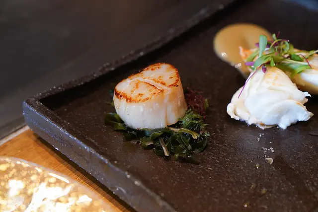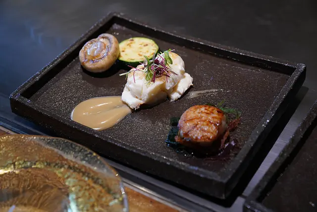 新鮮的龍蝦身,在嘴裡咀嚼的同時,回饋的是相當有彈力與鮮味的滿溢,一旁豐盈多汁的蘑菇也是相當誘人,我一定要說一下這個干貝!大約五分熟的質地,好鮮甜可口,內在軟嫩。