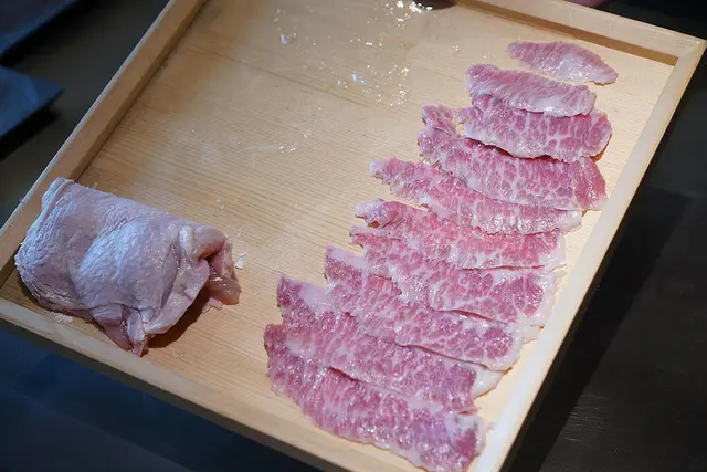 看看這頂級又誘人的油花,鋪成在日式陶瓷碗盤上,每一片都如初戀女友那般的迷人滋味,如此粉嫩、如此青澀,都必須小心呵護,細細品嚐那牛油在嘴裡散發的曼妙舞姿!