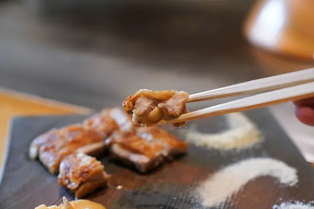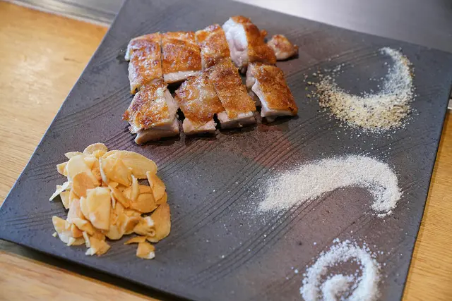 雞皮金黃焦香!讓人不禁食慾大動,蒜片、搭著松露鹽、芥末椒鹽、蒜味鹽每一個都相當美味,當然在嘴裡的反應更是有三種不同的滋味。