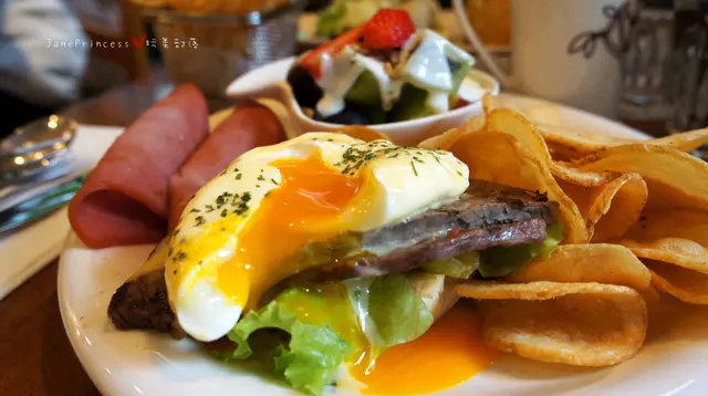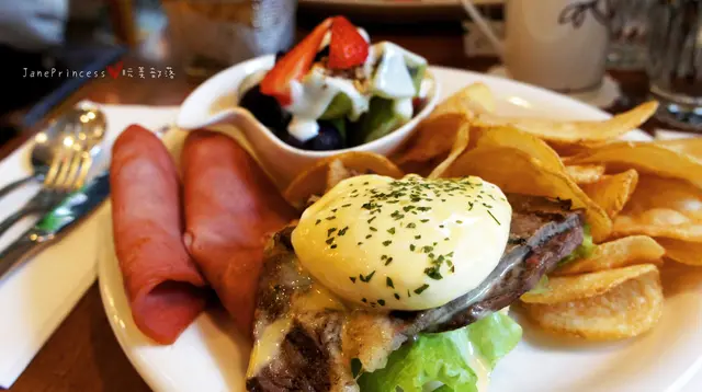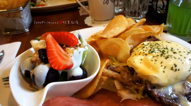有水果盅 火腿 現炸洋芋片 布里歐麵包 牛排和班尼迪克水波蛋