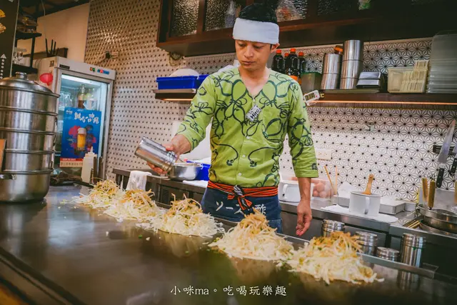 點好餐後就可以看Hiro店長大展身手啦,廣島燒和大阪燒、文字燒作法不同,廣島燒是把將食材往上堆疊,反覆煎熟,赤鐵廣島燒足足疊了11層,光看店長熟捻的動作就好像在看一場廚藝秀啊