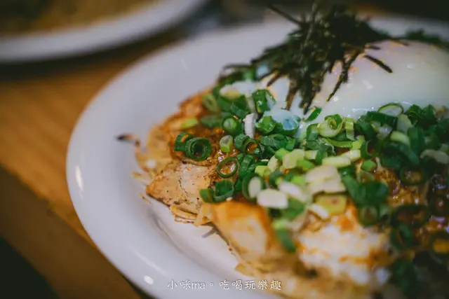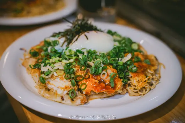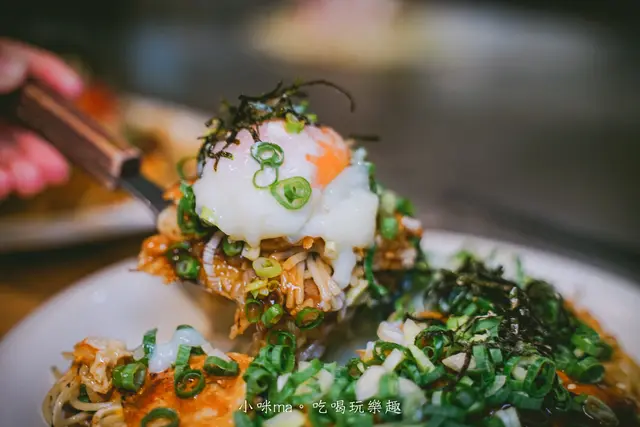 月見廣島燒也是店內的top系列,很多第一次來的朋友都會選擇這一個口味,中華麵配上層層配料,鋪上青蔥,放上一顆溫泉蛋就完成,底下的麵條因為反覆煎熟多了一點脆感,中間大量的梨山高麗菜絲增添濕潤度和甜度,整體口感不會太鹹膩,蠻適合第一次嘗試廣島燒的朋友