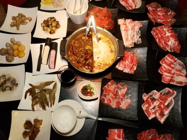 來吧~沸騰的辛殿麻辣鍋上桌了,搭配上多種肉品、海鮮、鍋物滿滿一桌要給你好吃呢。