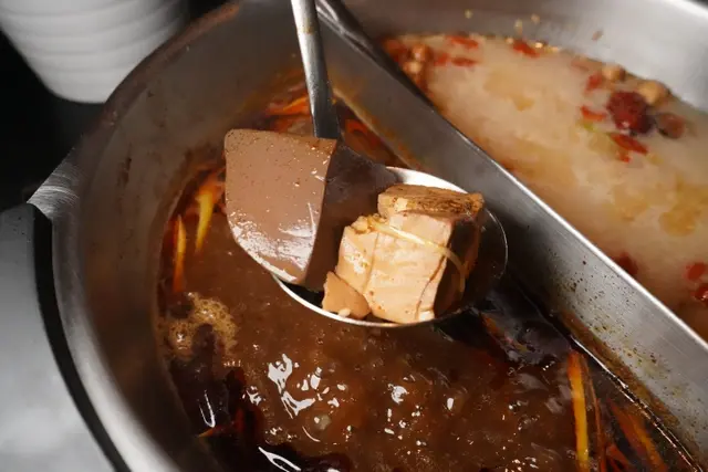 撈上一匙紅鍋的麻辣湯底,沸滾在冒泡裡可以感受到香辣十足,裡面同樣不馬虎給上了鴨血與豆腐讓人吃的爽快,獨家的中藥食材加上辣乾豆瓣等,這個風味讓人覺得很不錯,而通常上來的都是小辣,還想再吃更辣點的朋友可以再加辣上去包準爽快。