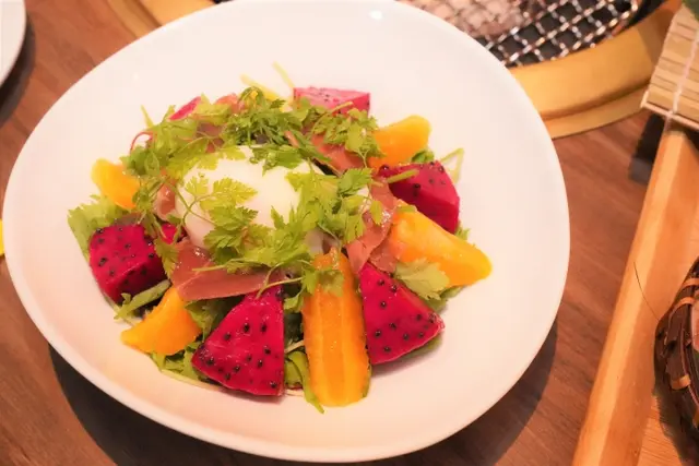 帕瑪火腿、火龍果、柑橘以及Baby Leaf貝比生菜、山蘿蔔葉