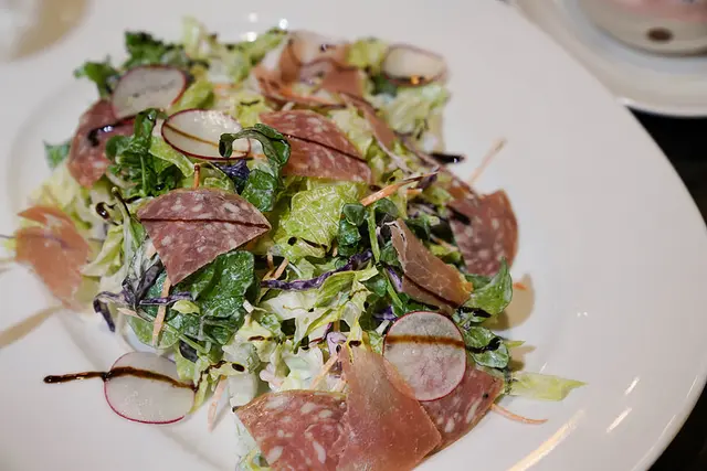 沙拉的份量也絲毫不手軟,火腿、香腸片、各式生菜