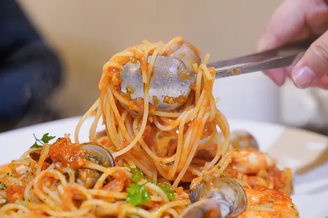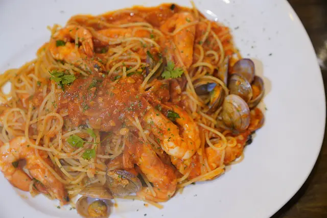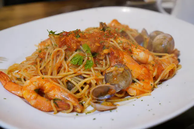 除了滿滿的麵條以外還有蛤蠣、鮮蝦!整個鮮味十足,當然番茄的醬汁更是義大利麵最搭的夥伴。