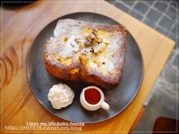 厚片的丹麥吐司外皮煎的金黃焦脆,灑上糖粉堅果