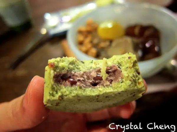 看起來很像綠豆糕,裡頭包著紅豆餡,之前在台中有吃過,