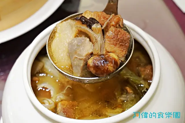 主廚先以大火熬煮雞、豬大骨、白蘿蔔、大蒜等,後再加入金華火腿,以文火熬製3小時,熬出濃烈香氣的金黃色湯頭,其湯料則選用黑魚皮、香菇、豬腳丁、土雞肉、芋頭、栗子、干貝先炸後滷,保持原汁原味也提升香氣風味,最後再加上擁有豐富膠質的月眉翅,香氣濃烈的湯頭與營養豐富的配料完美結合。