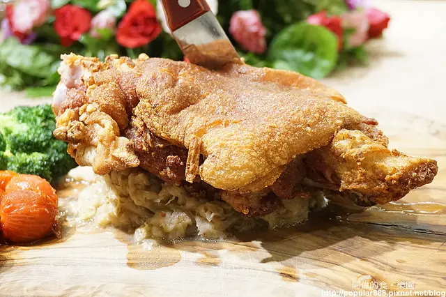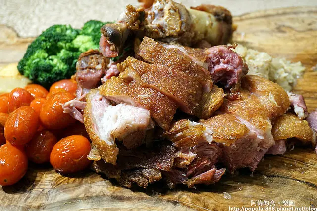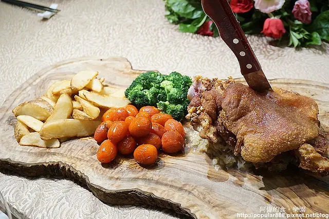 除了一大塊的豬腳,還有花椰菜、烤過的小番茄及薯條