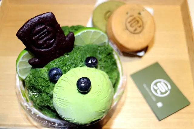 抹茶熊伯爵是用料不手軟的抹茶淋醬,把刨冰變成了好抹好抹的熊頭。自製的巧克力餅乾上烙印著108,是熊伯爵帥氣的帽子呢!加上藍莓做成的眼睛鼻頭,抹茶冰淇淋的大鼻子,檸檬片的耳朵,刨冰底下還有紅豆泥+蕨餅+抹茶果凍。
