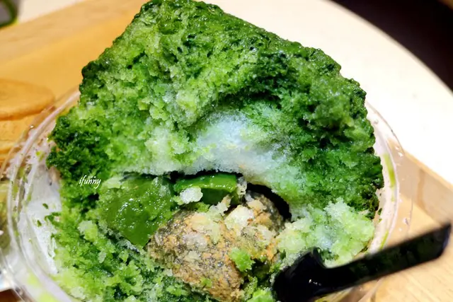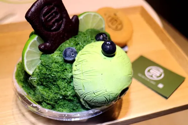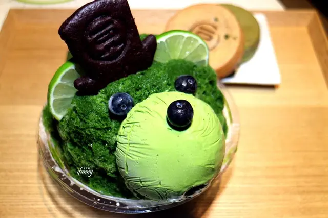 接著再刨上清冰塑型成小熊頭形,再用料不手軟地淋滿抹茶醬,還有一大球的抹茶冰淇淋當鼻子,藍莓做成的眼睛鼻頭,,檸檬片的耳朵,這簡直是萌度破表啊!