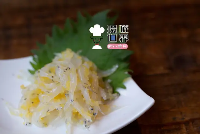 使用新鮮的透抽切絲,運用海鹽與清酒跟透抽的肝臟融合再一起,