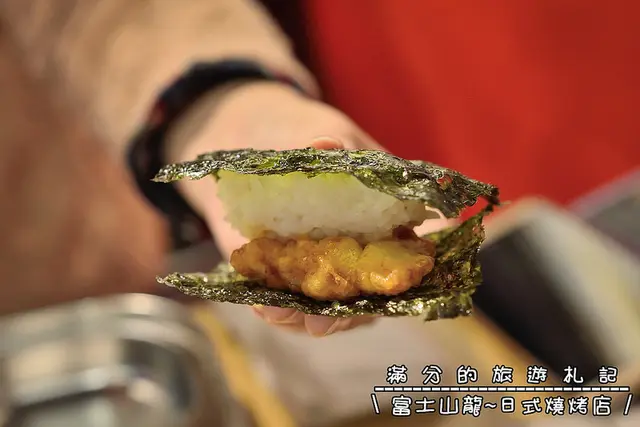 搭配海苔一起食用,雞肉外皮酥脆鮮嫩多汁,夾入飯團和海苔口感更佳, 滿分還蠻喜歡的呢