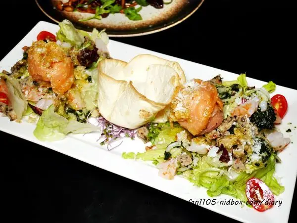 楓丹海鮮庫司生菜烤餅柳橙油醋 煙燻鮭魚與各式海鮮與新鮮的生菜搭配酸甜的柳橙油醋醬,