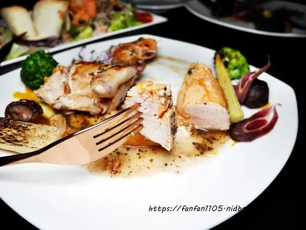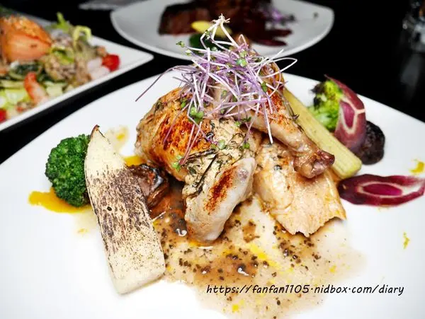 法式普羅旺斯香科春雞低溫烹調佐夏松露醬汁 雞肉帶有法式香料與松露的香氣,