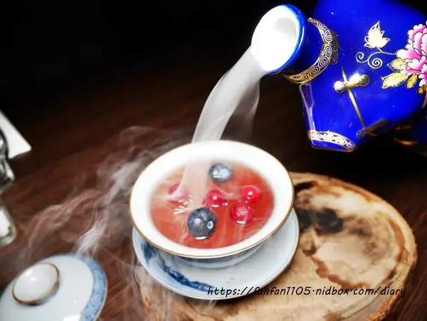 使用復古風的旗袍盛裝著莓果系的酒類,