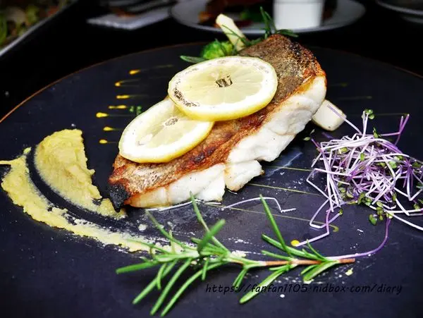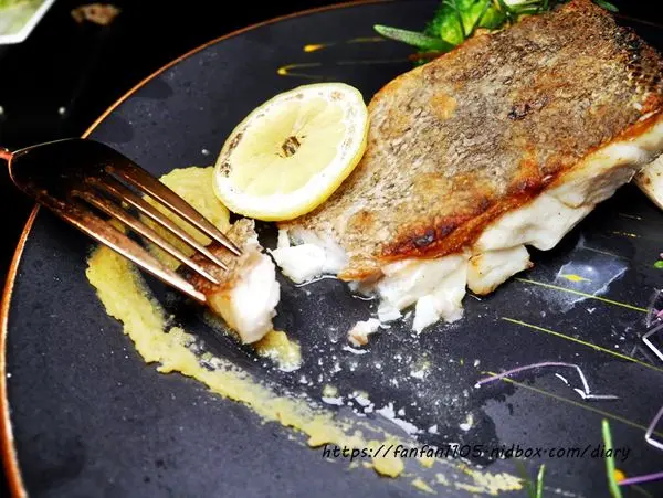 長崎野石班魚爐烤佐黃檸檬豌豆醬 石班魚表皮煎的酥香,魚肉細嫩且多汁,