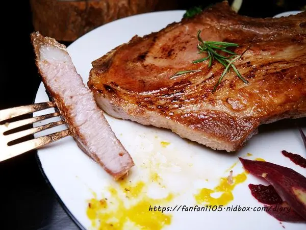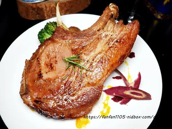 噶瑪蘭純種黑豚帶骨OP肋排佐紅胡椒汁 好大一塊肉排,外表煎得金黃焦香,