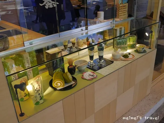 店門口則擺放著販售商品的展示,除了內用的抹茶芭菲外,還有外帶的茶葉豆、抹茶大福、抹茶生巧克力、抹茶卡布奇諾...等等