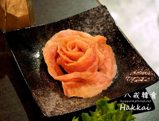 首先上場的是豬頸肉,生肉以玫瑰的方式呈現,美麗又高貴。菜單上標示著八戒韓食的豬肉都是採用台灣在地的優質豬肉。