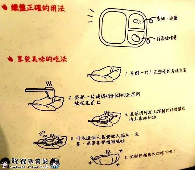 八戒韓食也建議肉品可以使用生菜來夾取,菜單內有放上食用方式的詳細步驟。