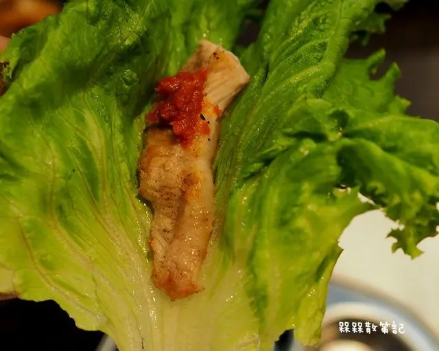 首先將攤開的生菜放上肉品,之後再放上泡菜、豆芽菜等,最後沾上味噌醬與香油,包夾在一起吃。