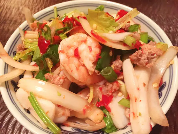 以鮮蝦、花枝、肉末及洋蔥、芹菜....辛香料聯合製成。