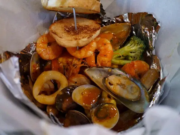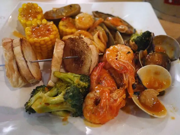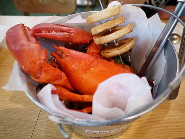 海鮮桶內除了龍蝦之外還有白蝦、但菜、花枝、干貝、蛤蜊、花椰菜、玉米、熱狗和麵包。