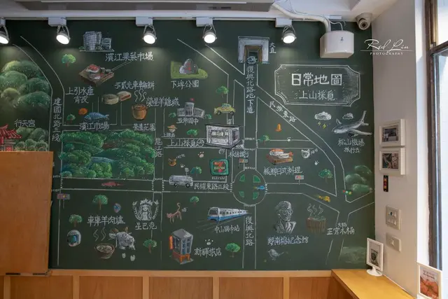 前陣子店家才進行小裝修。一旁牆面則變成黑板的插畫。上面有整個復興北路周遭商圈的地圖,而且畫的好細緻呀~