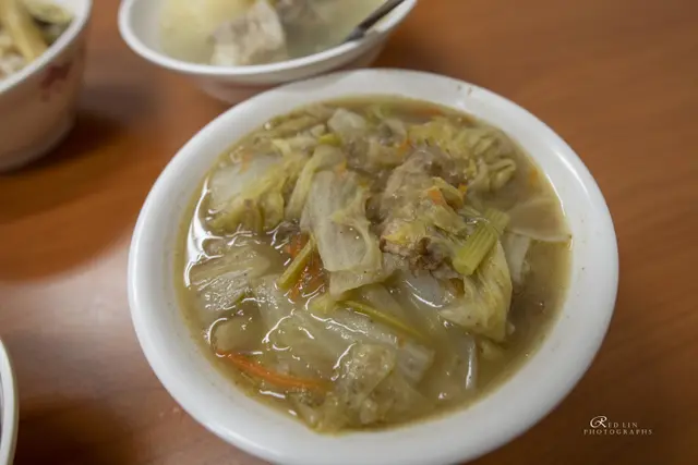 他們家的滷白菜比較像辦桌的羹湯,料很多,除了白菜之外還有芋頭、粉絲、芹菜等配料。不過白菜滷的軟爛,口味也不錯喔~