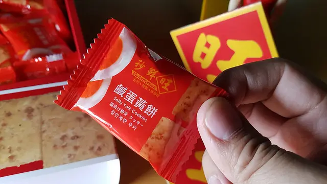 酥脆的基底上頭,加上了鹹蛋黃在傳統的方塊酥上多增添了一份鹹香滋味